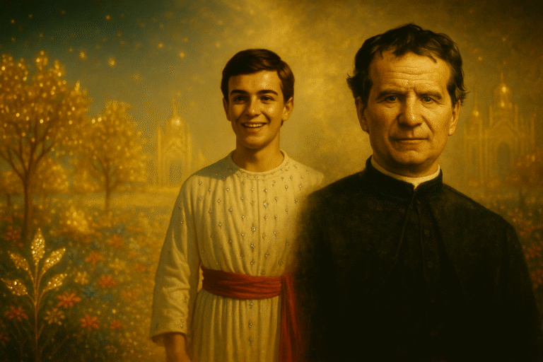En medio, surgían palacios tan majestuosos que, según Don Bosco, ni todos los tesoros de la tierra bastarían para construir uno solo. Y mientras contemplaba aquello, escuchó una música celestial: miles de instrumentos y coros unidos en una armonía perfecta que llenaba de gozo.